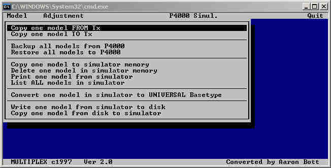 P4000 is Multiplex's original backup software, written back in the days of MS-DOS. MPX/Hitec have kindly offered to make it available from this site but note it is no longer supported. Depending on your hardware,you may be able to run it under 9x as it is, or under XP with the help of a port-grabbing utility.