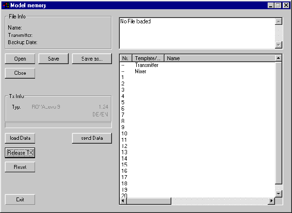 - These options manage the transmission of model data to/from the Tx. This is from the point of view of the software, i.e. Load means 'Get Data From Tx', Send means 'Send Data to Tx' (Why doesn't it just say Get Models and Send Models?). No file management is involved, all the activity is in memory.