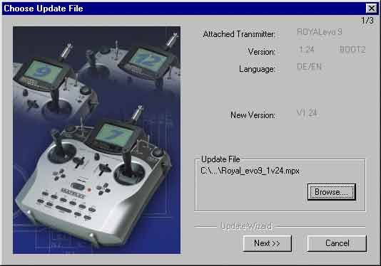 The Royal Evo is the first radio of which I am aware which sports user-updatable firmware. The tool which Multiplex provide for accomplishing the updates is called Data Manager, and it is available as a free download. The software also features a model data restore/backup facility.