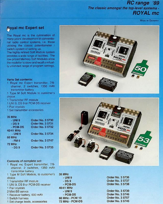 One transmitter could do gliders, aerobatic aircrafts, and helicopters. With the Royal Expert shown here, there were a lot of different EEproms availlable even a Nautical one. Way ahead of its time - when all others merely had end point adjust and servo reverse.