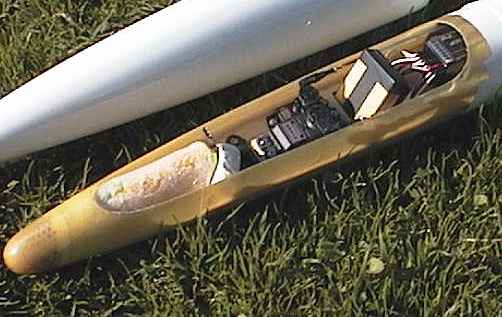 Bill Watson used this refined installation in his "Emerald" sailplane as shown above and in the heading photo. Modern piezo-electric gyros are small enough and draw little enough current to be easily practical in thermal sailplanes. The gyro is the small rectangular solid located in the forward fuselage just behind the two servos as shown in the close-up figure. It is tilted back 30 degrees from the yaw-only, horizontal orientation. The specific gyro Bill used is marketed in the United States by Hobbico as the "Airplane Piezo Gyro Stabilizer". This is sold by Tower Hobbies as stock number TH1919 for $129.99.