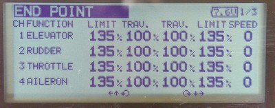 Servos can be adjusted for gain, direction and end-points. I was pleased to see that the end-points act as true electronic end stops, essential on models which use aggressive mixing. On the downside, these adjustments are too crude to match up the movement of large paired control surfaces like flaps, where even the slightest differences in linkage geometry can cause subtle mistracking which is difficult to correct. It's a shame that Futaba did not include an AFR (curves) option for each servo, in order to correct for this.