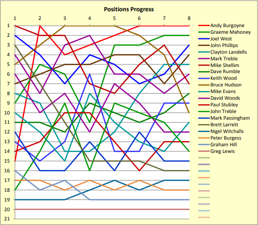 1 A Burgoyne 6282.13 1000.00 2 G Mahoney 6182.99 984.21 3 J West 6150.31 979.01 4 J Phillips 6121.34 974.40 5 C Landells 6079.36 967.72 6 M Treble 6018.24 957.99 7 M Shellim 6000.27 955.13 8 D Rumble 5963.87 949.33 9 K Wood 5963.69 949.31 10 B Hudson 5905.27 940.01 11 M Evans 5787.18 921.21 12 D Woods 5759.84 916.86 13 P Stubley 5746.41 914.72 14 J Treble 5705.57 908.22 15 M Passingham 5668.40 902.30 16 B Larrett 5611.32 893.21 17 N Witchalls 5253.15 836.20 18 P Burgess 5037.70 801.90 19 G Hill 4955.58 788.83