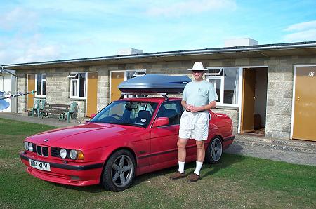 John and McCurdy-mobile outside chalets at Atherfield Bay. Cliffs were a 200m walk away.