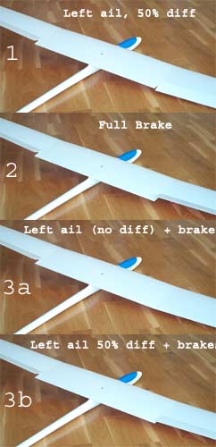 Photo 3b shows the effect, note there is very little roll couple from the ailerons. Photo 3a shows the effect of aileron differential suppression (ADF). As crow brake is applied, differential is reduced to zero, thus restoring full downward movement to the aileron and improving roll control. To implement ADF,