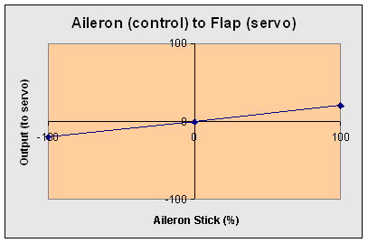 The first curve will set the response of the inner flap servos to a Spoiler control input. We will assume that the flap linkage geometry has been adjusted to allow full servo travel for full flap deflection, i.e. one end of servo travel corresponds to flap surfaces at neutral, the other end is flap surfaces fully down.