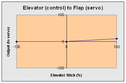 The snapflap curve: We arrange it so that feeding in down elevator has no effect, but pulling up elevator causes the inner control surfaces to deflect a small amount. (as a refinement, we could use a 5,7,9 or 13 point curve, to provide dead band and/or a maximum deflection, but this is best done using a Multimix.)