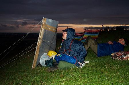 A few minutes later, still in almost pitch darkness, the model's lights disappeared completely as the model went into mist and low cloud. Visual contact was lost for about five, very long seconds before the model reappeared. Nick very coolly picked up control, and for the next 30 minutes flew the model actively in a figure of eight pattern below cloudbase, slightly out of the main lift area.