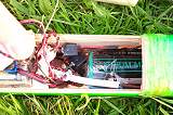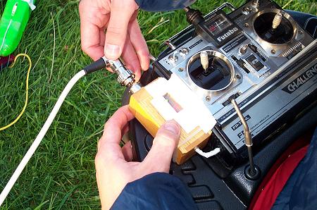 A Futaba Challenger Tx was used, powered by seven D-size NiCd cells carried externally. The battery pack could be hot-swapped in flight. During changeover, the internal pack switched in automatically.